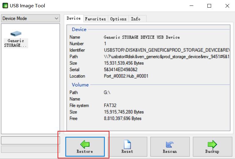 解压USB Image Tool打开USB Image Tool.exe,选择你的tf卡设备,点击Restore选择下载的系统即可